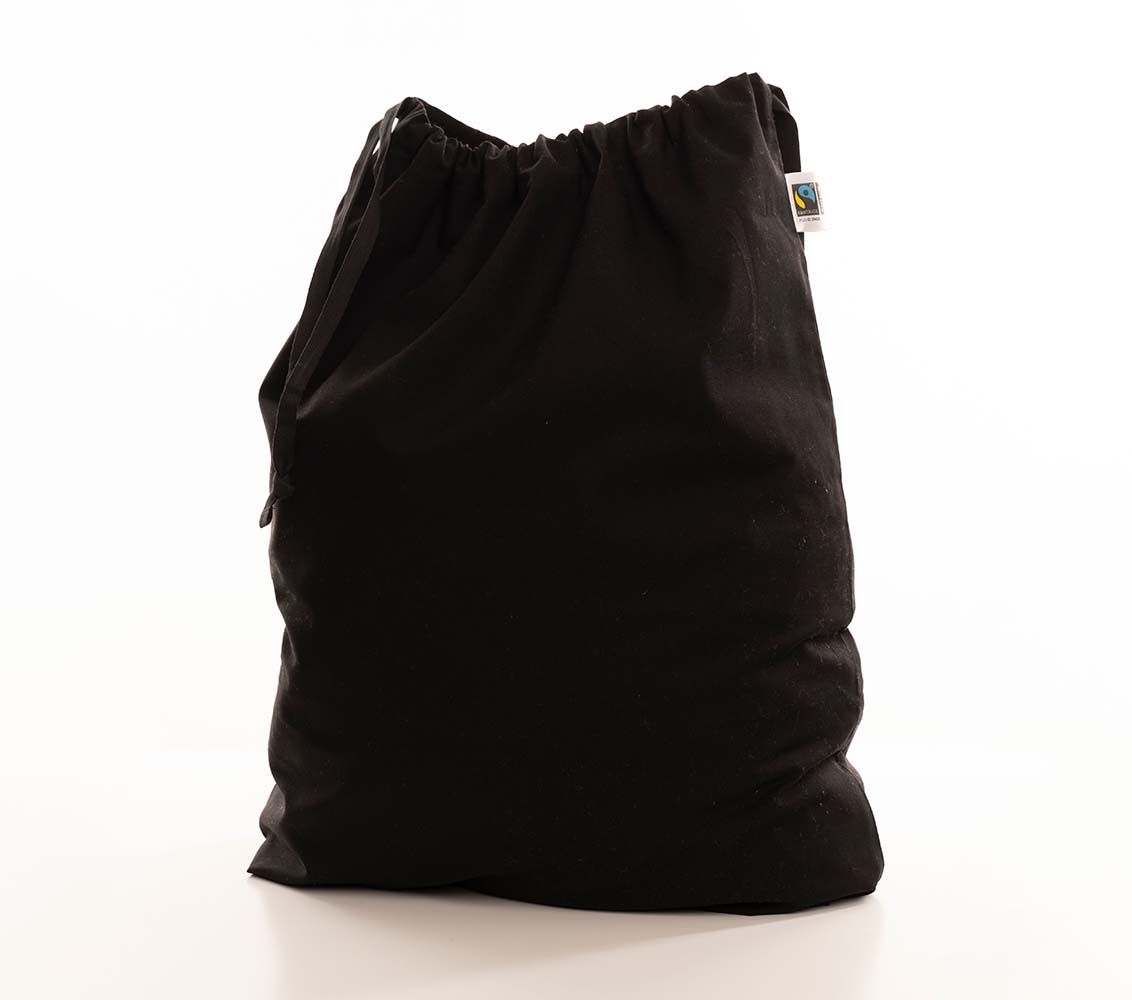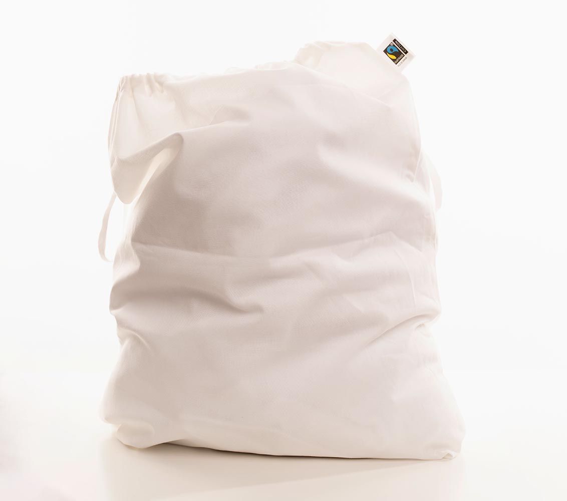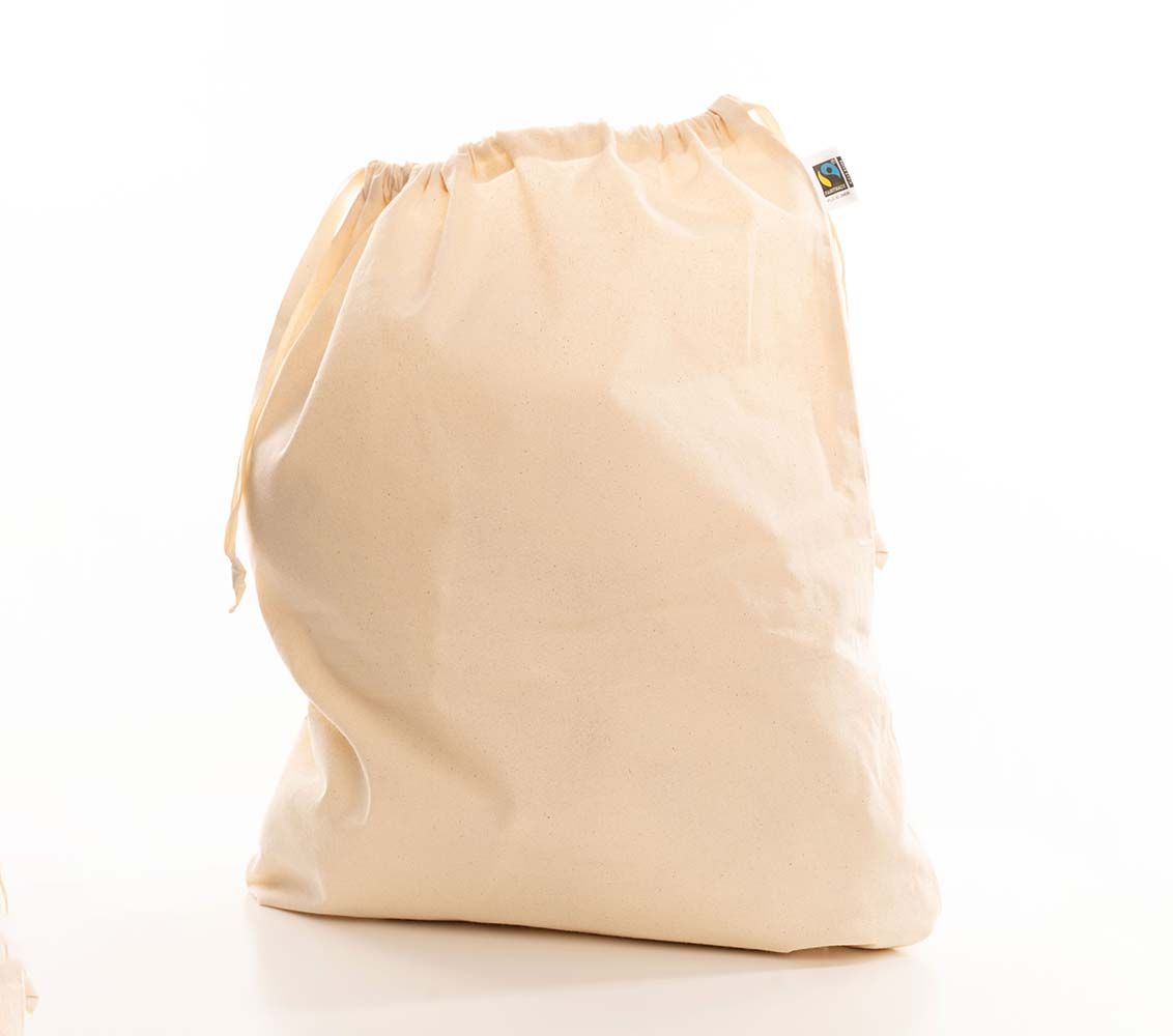 Woreczek organiczny niemieckiej marki PRINTWEAR® uszyty z bawełnianego płótna o gładkiej powierzchni. Wiązanie i zaciąganie górnej krawędzi tasiemkami w tym samym kolorze. W górnej części wszyto metkę potwierdzającą przyznanie certyfikatu FAIRTRADE®.